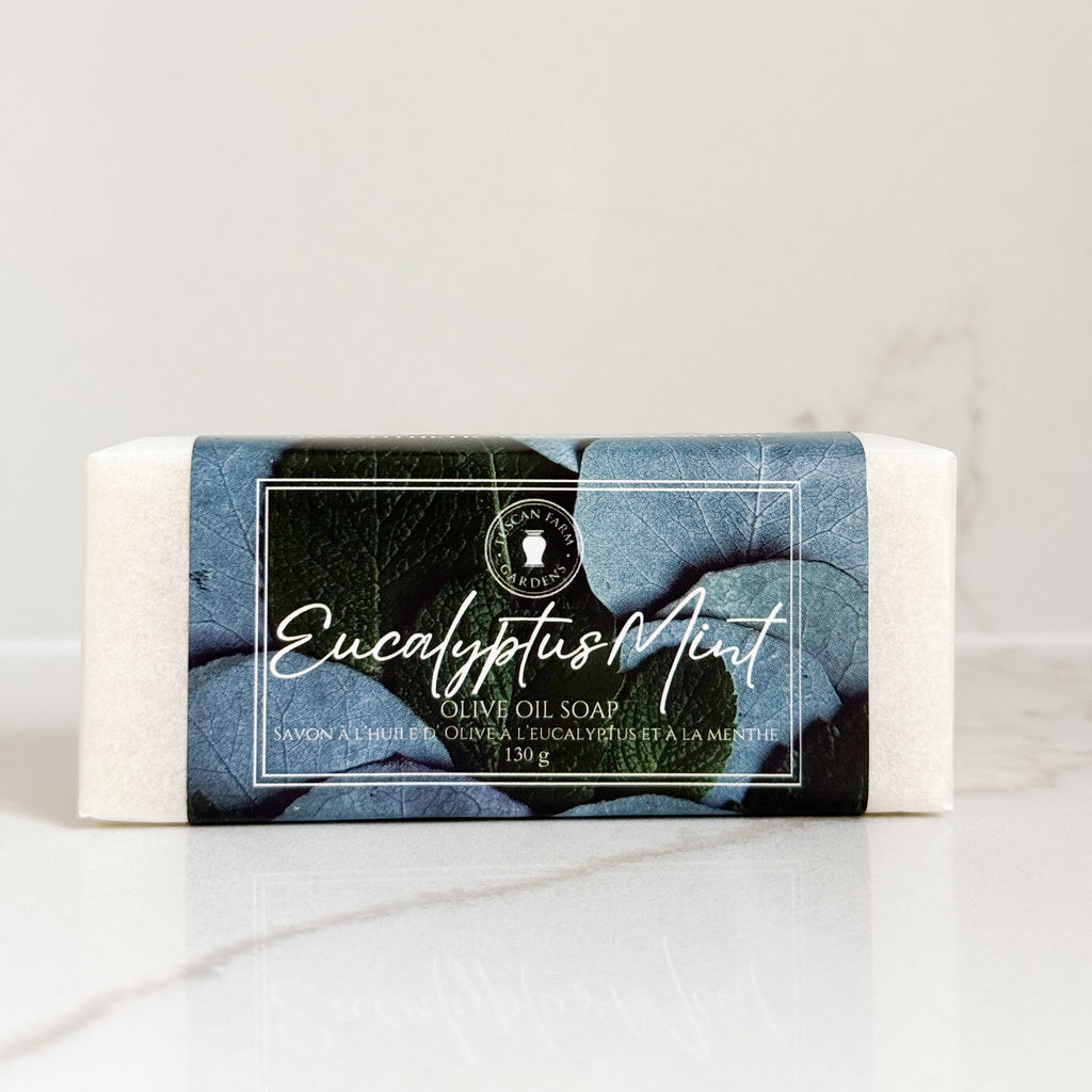 Cold-pressed olive oil, coconut oil, rice bran oil, castor oil, mango butter, apricot oil,  avocado oil, jojoba oil, essential oils of eucalyptus and peppermint.